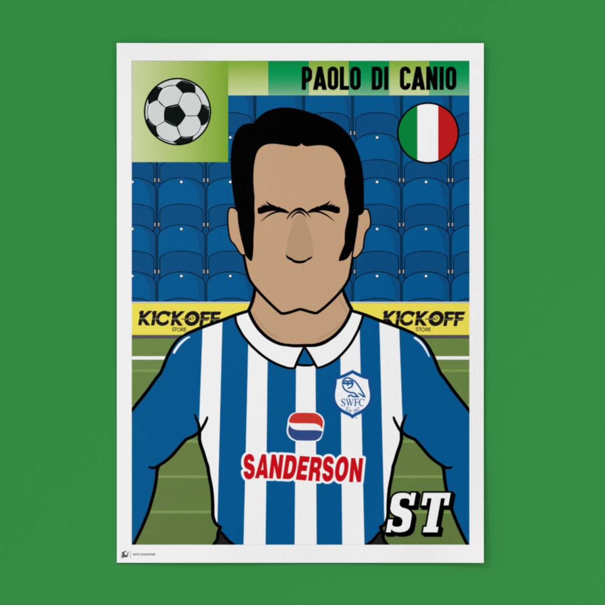 Designed by local artist Matt Cockayne, this sticker features bold, colourful pop-art artwork in classic Panini style, perfectly capturing Di Canio’s charisma and attacking brilliance. A must-have for collectors of retro football memorabilia.