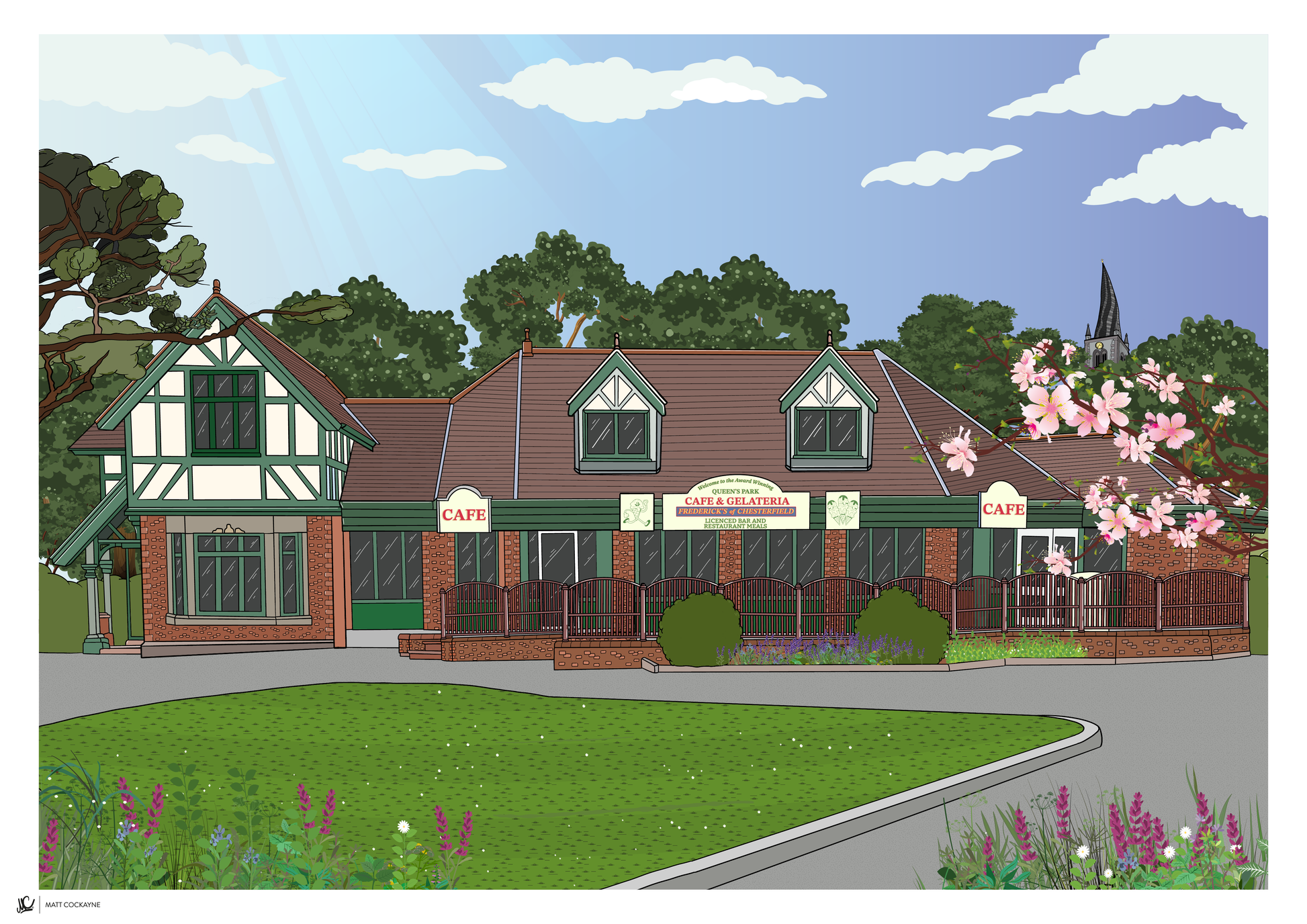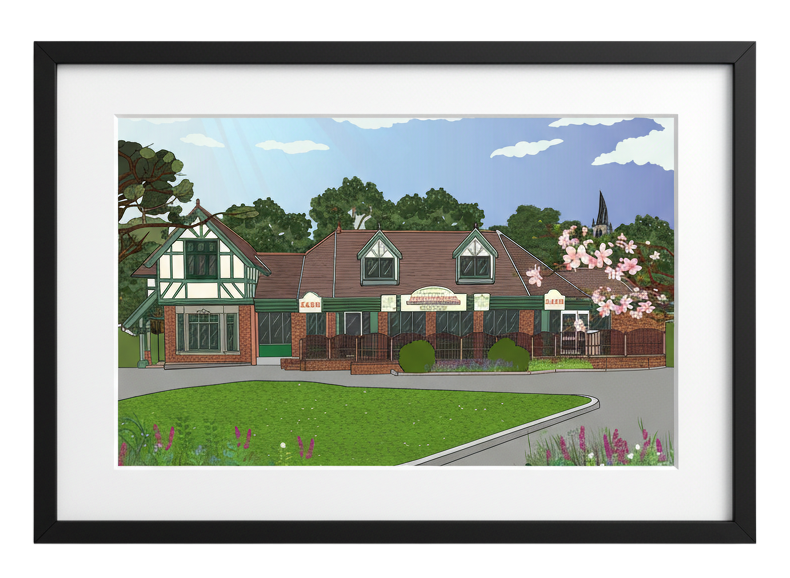 This artwork captures the much-loved Queen’s Park Café in Chesterfield, illustrated in my bold, graphic style with a fresh, spring feel. Set within the heart of Queen’s Park, the café is a familiar meeting point for walkers, families and park regulars, making it a special local landmark.